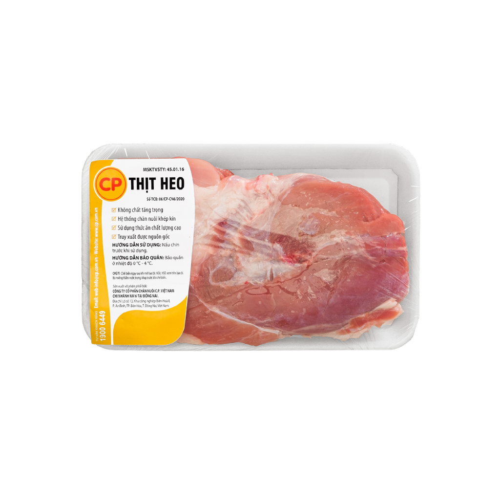 Thịt bắp giò heo C.P là phần thịt ít da và gân hơn chân giò, nhưng lại rất mềm nhờ các thớ thịt được đan xen giữa lớp mỡ mỏng quanh xương ống.