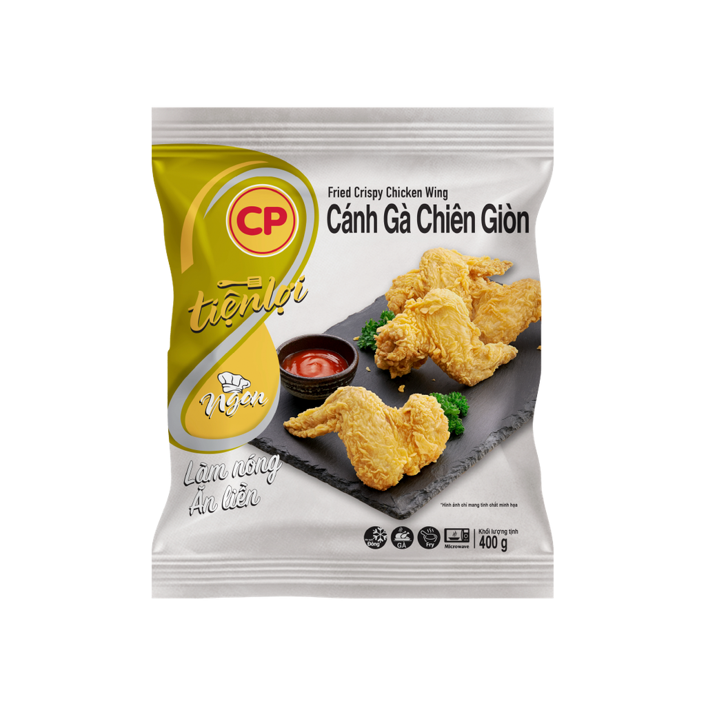 Cánh gà chiên giòn vị truyền thống CP là món ăn làm sẵn thơm ngon, đầy dinh dưỡng và kích thích vị giác, được chế biến từ những chiếc cánh gà tươi ngon, tẩm gia vị truyền thống và phủ lớp bột chiên xù giòn rụm. Món ăn này mang đến hương vị đậm đà, giòn tan bên ngoài và mềm ngọt bên trong, rất thích hợp cho các bữa ăn nhanh, ăn vặt hoặc ăn cùng cơm trắng. Sản phẩm tiện lợi, dễ chế biến và là lựa chọn hoàn hảo cho những ai yêu thích hương vị thơm ngon, giòn giòn.