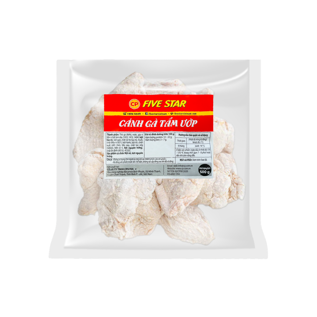 Cánh gà tẩm ướp là cánh gà chính hãng từ trang trại CP, được tẩm ướp sẵn gia vị và bột chiên theo công thức của thương hiệu Five Star. Chỉ cần 10 phút chiên chín, bạn đã có ngay đĩa gà chuẩn vị, thơm ngon không kém nhà hàng, là lựa chọn tuyệt vời cho bữa cơm cùng gia đình và bạn bè.