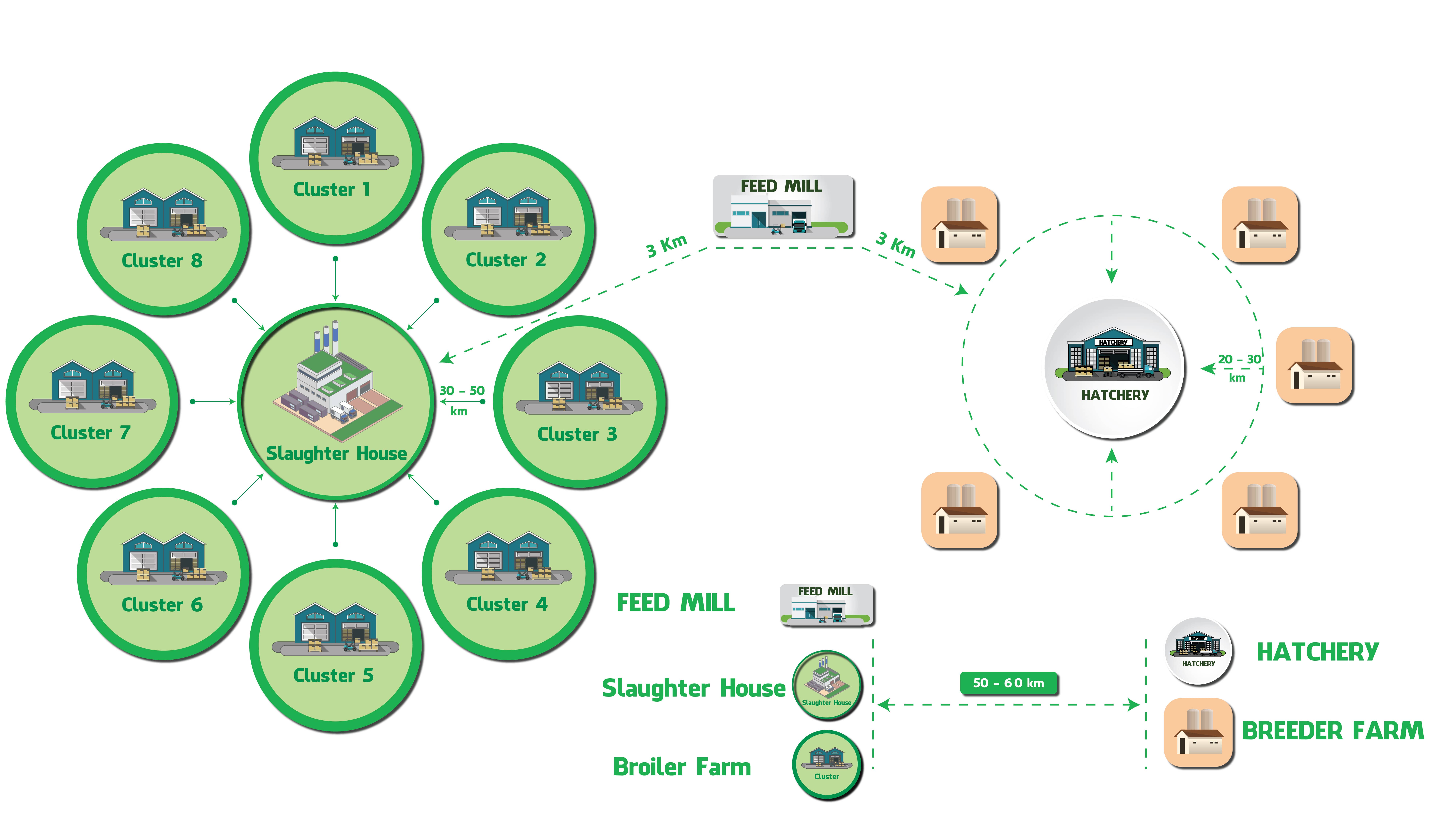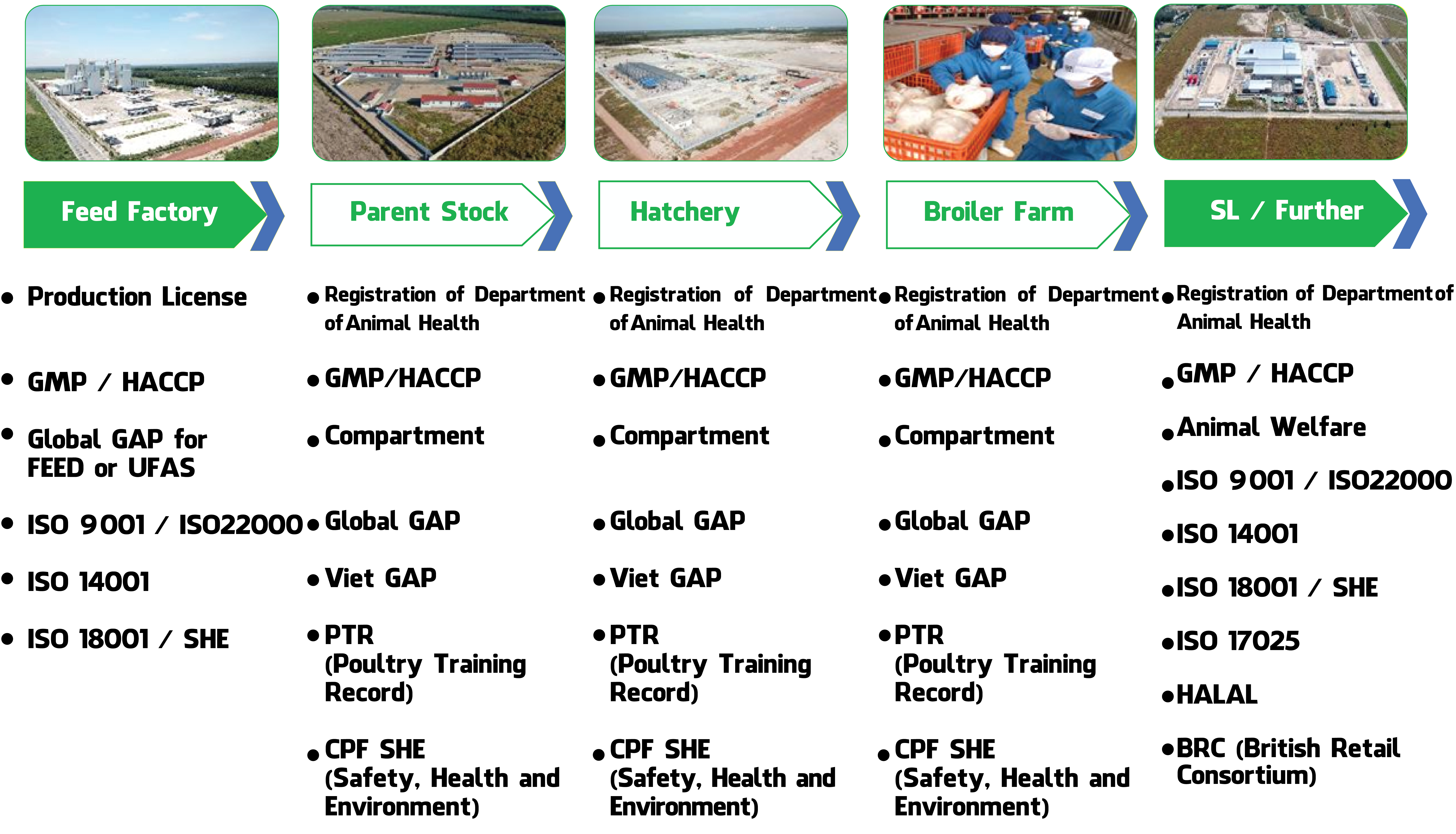 Hệ thống 5 trang trại gà giống nằm trong chuỗi cung ứng khép kín của công ty. Các trang trại tuân thủ hệ thống quản lý theo tiêu chuẩn quốc tế ISO, GMP / HACCP, phúc lợi động vật, PTR, SHE.
