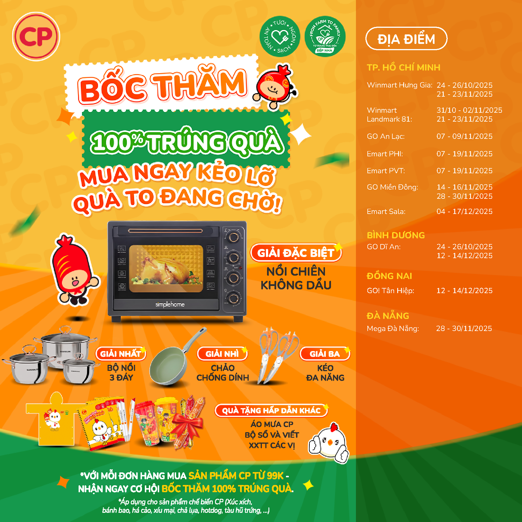- Quà tặng hấp dẫn khác: Áo mưa CP, Bộ sổ và viết, xúc xích tiệt trùng các vị.